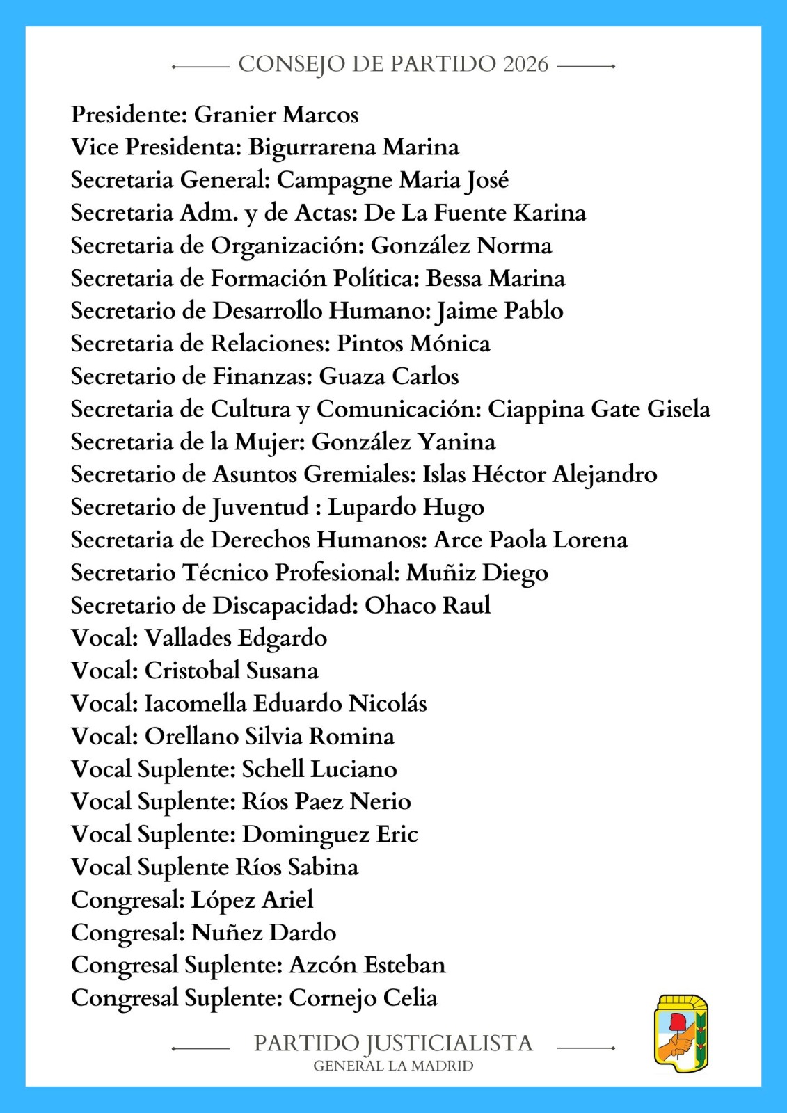 Luego de muchas idas y vueltas, el PJ de General La Madrid dio a conocer la conformación del Consejo que conducirá el Partido a partir de marzo. Insistieron que “no habrá interna porque es la única lista que se presentó”. Como ya se había anticipado, Marcos Granier será el presidente y estará acompañado por varios dirigentes históricos, además se suman nombres nuevos.