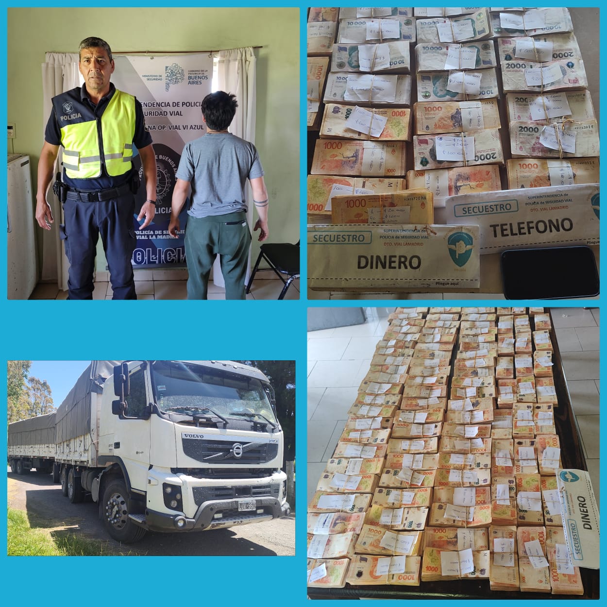 Desde el Destacamento Vial se detalló que siendo las 11:45 horas, en el marco de una orden de servicio, se interceptó ciudadano que circulaba en camión Volvo con semirremolque, conducido por masculino mayor de edad, oriundo de General Arenales, quien transportaba dos cajas herméticamente cerradas escondidas detrás de asiento con un total de 33.933.120 pesos.