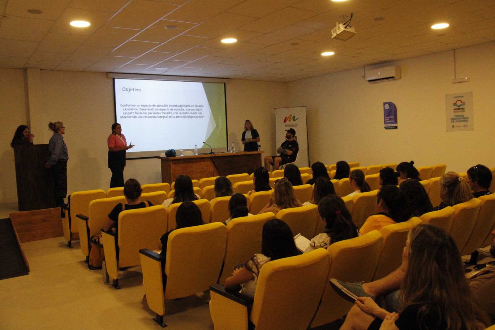 Ante un buen marco de público, especialmente integrado por estudiantes del Instituto que se ubicó en el auditórium de Puente Innova se desarrolló la jornada que tuvo dos partes: durante la primera, integrantes del equipo interdisciplinario de Terapia cannábica del Hospital “Dr. Mariano Echegaray”, Alejandro Arbeo (ONG de cultivo LAMACANNA) y Marita Cantero (usuaria) contaron sus experiencias, luego se hizo una ponencia común sobre la temática.