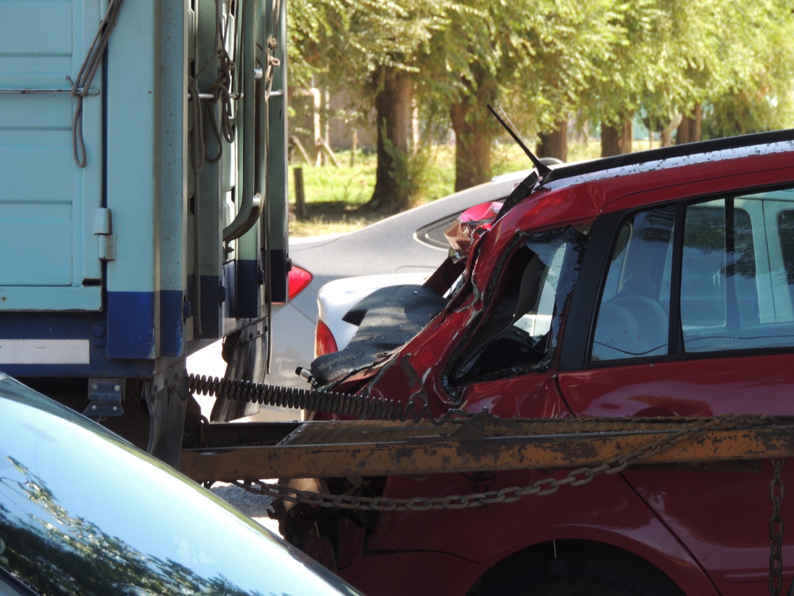 Testigos del hecho señalaron que el transporte tuvo un inconveniente mientras iba doblando, el acoplado se soltó y terminó embistiendo ambos autos.